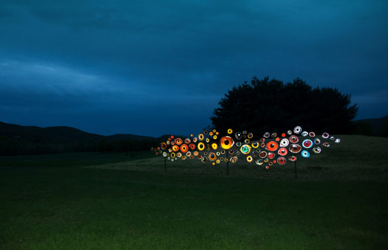 Image: Birds Watching (as part of Indicators: Artists on Climate Change at Storm King Art Center ), 2018–2019, Printed reflective film mounted on aluminum with steel frame, 10 x 40 x 1 ft