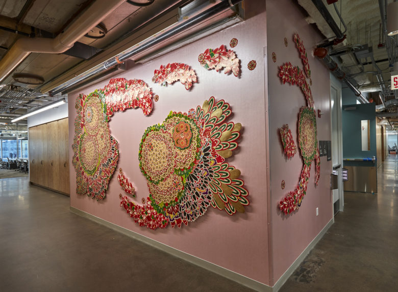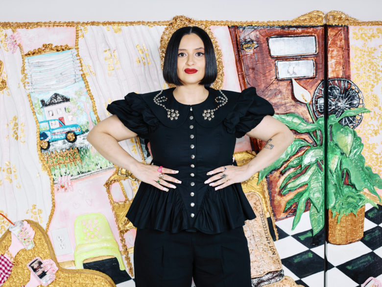 Yvette Mayorga is a multidisciplinary artist based in Chicago, IL. Her works link feminized labor and the aesthetics of celebration to colonial art history and racialized oppression through the guise of using pink as a weapon of mass destruction. They flaunt a maximalist aesthetic rooted in personal narrative and familial histories to examine the Latinx experience in the US. Mimicking the confectionary labors performed by bakery workers, Mayorga uses piping bags to thickly apply her signature bubblegum pink acrylics to varying sized canvases.