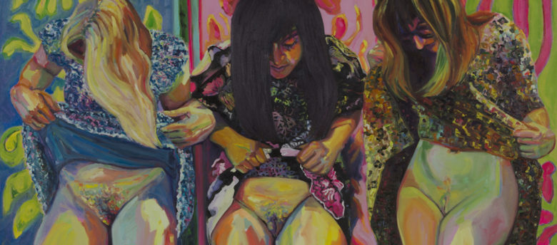 Her paintings are experiential, psychological and inhabited by new feminist archetypes. These painted forms reveal themselves through heightened color, loose pattern, and uncouth texture. Organic shapes and tangled marks are executed with a loaded brush. This allows the figures to exist in a field of constant motion despite painting’s persistent stillness. From within these silent cacophonies she wants her viewer to contemplate life, our histories, womanhood, desire, tension, friendship and love.