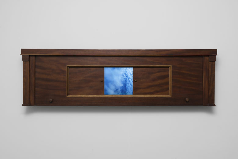 Image: untitled (open sky), Livestream video of open sky housed in a 1918 Kimball player piano’s cabinet window.