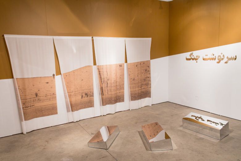 Image: Maryam Taghavi, A Flight into the Abyss, 2019. Acrylic glass, fabric print, digital print on fabric. Installation dimension: 20 x 10 ft.