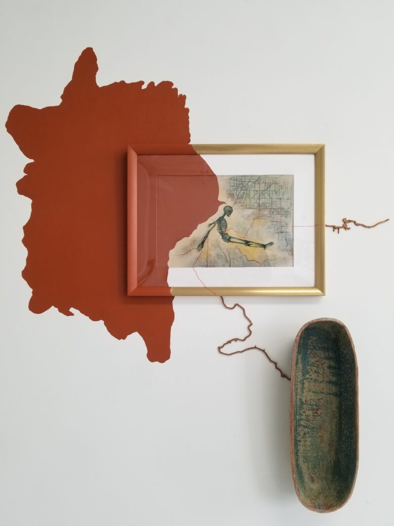 Image: I've Arrived, 2020. Acrylic, Wood, Ceramic. 36 x 34 x 6 in.