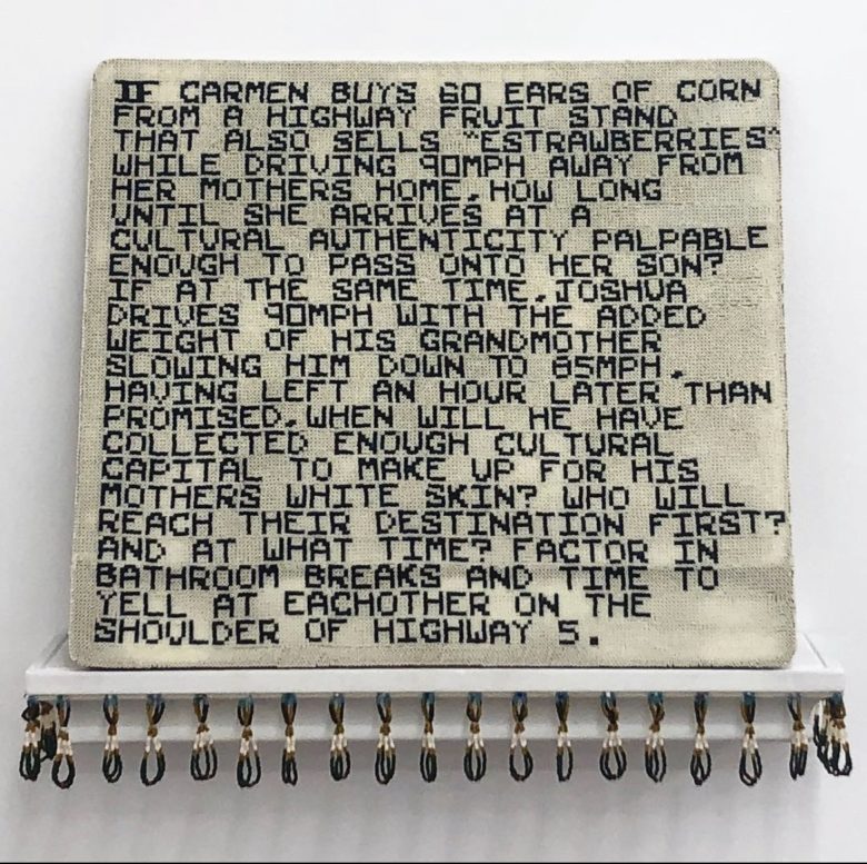 Sophia Karina English (they/them) is a latinx crafts person, sculptor, and performance artist from San Francisco,CA and based in Chicago,IL. Presented with a series of eradicated cultural and personal histories due to colonization, poor record keeping, and family secrets, English uses their work to ask questions and keep track of what feels important at the time. Working from their home studio English uses beadwork as reference to the Latin American tradition of storytelling through beaded textiles.