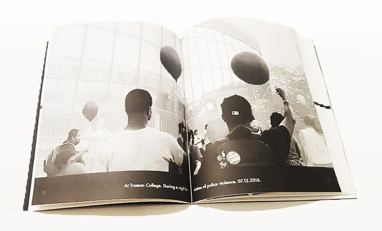 A black and white image shows a group of people holding balloons before releasing them to the sky. The bottom text reads, “At Truman College. During a vigil for victims of police violence. July 12th, 2016.”