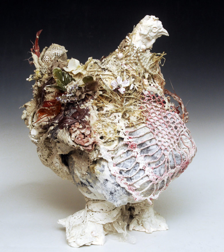 Image: Heritage Hen, 2018, Media: Fired and unfired clay, lace, fabric, pearls, feathers, hair, found object, Dimensions: 16 x 17 x 13 inches