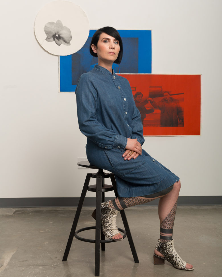 Baker received an MFA in Fiber from Cranbrook Academy of Art and a BFA from the School of the Art Institute of Chicago. She has exhibited both nationally and internationally, including in Chicago, New York, Santa Fe, Minneapolis, Budapest, and Toronto. Some notable exhibition venues include Bert Green Fine Art (Chicago, IL), Riverside Art Center Sculpture Garden (Riverside, IL), Currents New Media Festival (Santa Fe, NM), The Soap Factory (Minneapolis, MN), The Hyde Park Art Center (Chicago, IL), Urban Institute for Contemporary Arts (Grand Rapids, MI), and The Luminary Arts Center (Saint Louis, MO). She has been the recipient of artist’s grants and residencies from Hambidge Art Center (Rabun Gap, GA), The Vermont Studio Center (Johnson, VT), Chicago Department of Cultural Affairs, Illinois Arts Council Agency, Center Program Residency-Hyde Park Art Center (Chicago, IL), and Chicago Artists Coalition (Chicago, IL). She has received three SSA public art grants from chambers of commerce across the city of Chicago for the Chameleon Blind Window Project.