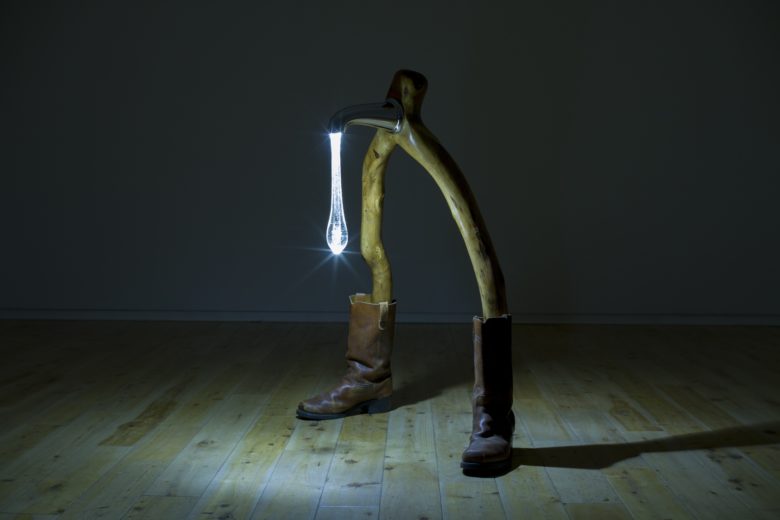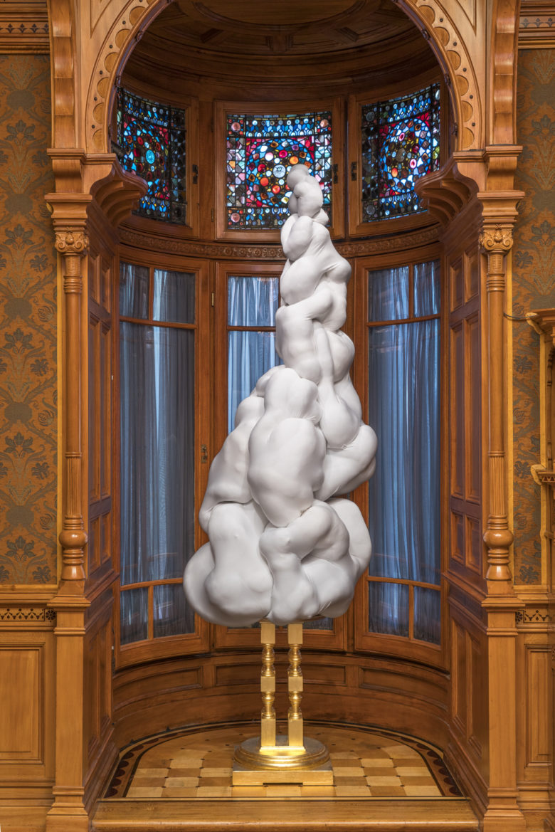 Image: Decorum 2024 Panyhose, fiberfill, lycra, reassembled salvaged wood, imitation gold leaf. 107 x 16.5 square (base) x 35 in. Photography: Bob. (Robert Salazar and Robert Heishman)
