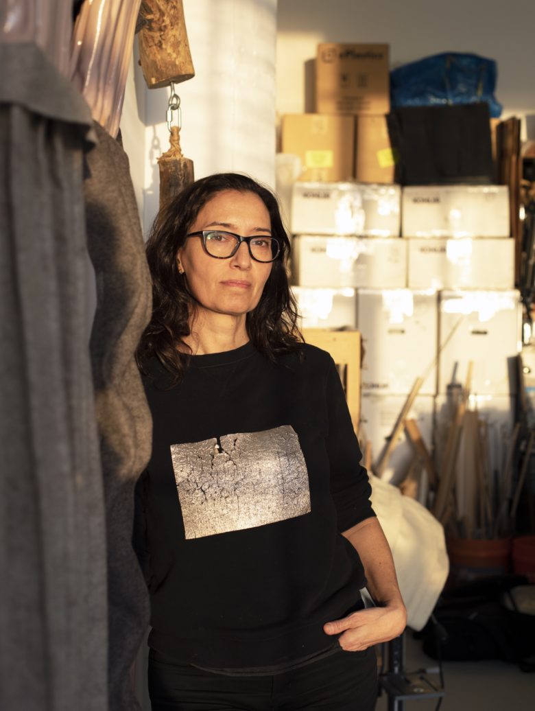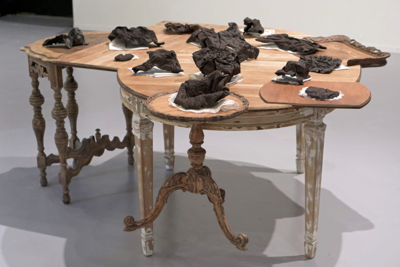 Image: Wen Liu, For Those I Have Never Met Found, handkerchief ash, found table cloth ash, clay, reclaimed wood 36 x 80 x 70 inches
