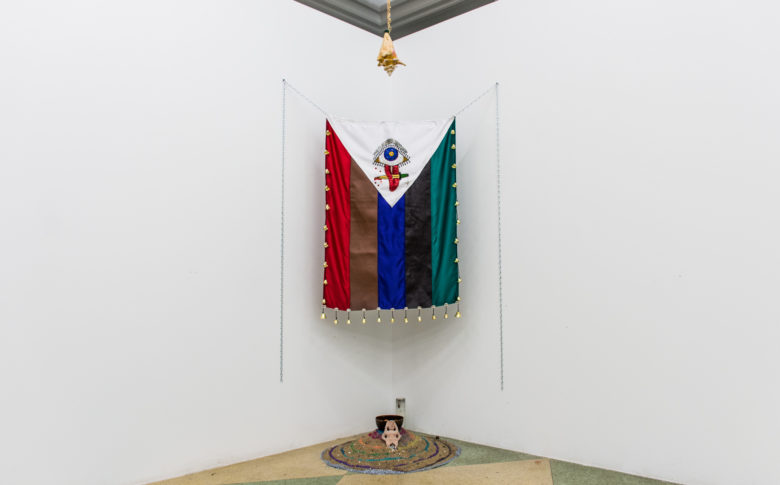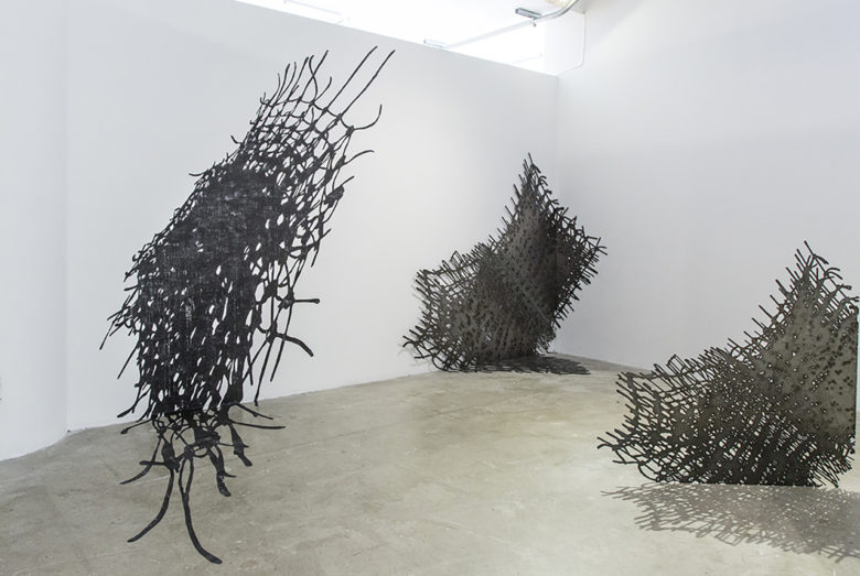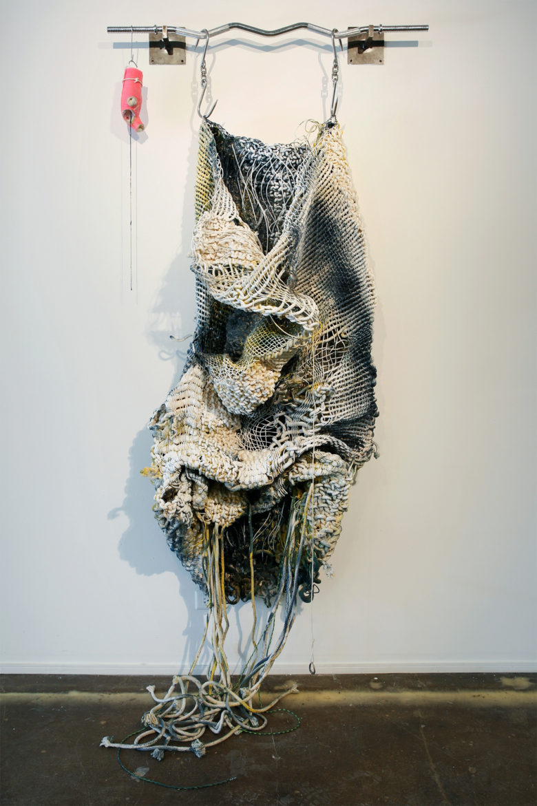 Image: Untitled: The Low Lands (a loved one), 2019, Medium: braided cotton cord, curl bar, pink cast (right hand), gold chain, meat hooks, enamel, nylon, spray paint, charm, Dimensions: 96"x48"