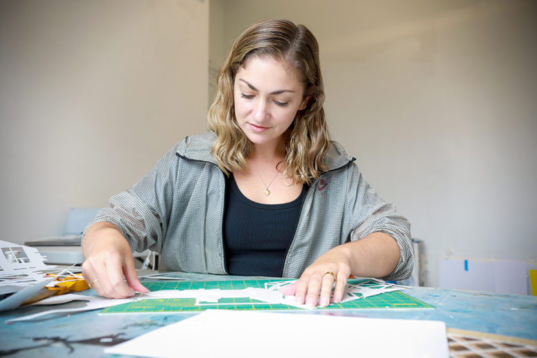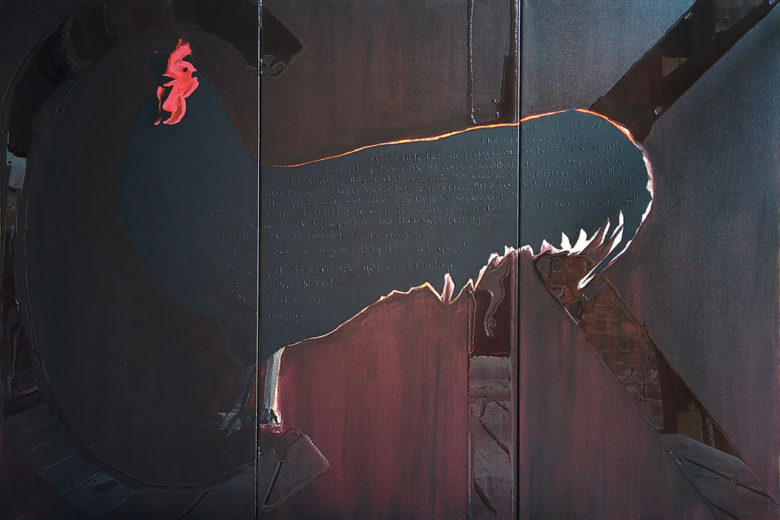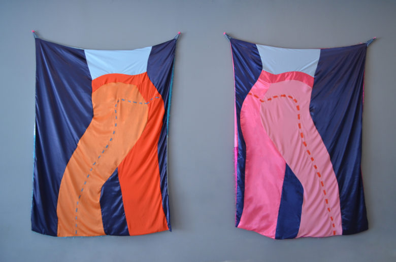 Best known for her large-scale fabric piecework collages; Marie Baldwin dissects visual and linguistic moments in pop culture, and seeks to create idiosyncratic spaces through print, sculpture and installation. Her practice navigates the intersection of familiar and foreign spaces through reworked examinations of fragmented artifacts that hold social significance, displaced from their original period and meaning. Predominately working with text, cloth, thread and reclaimed textiles, her work explores themes of sexuality, personal history, and the body. Learn more about Marie Baldwin’s HATCH exhibition ORWELLIAN OFFSPRING.